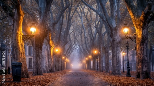 tree, fog, pathway, street light, autumn, leaf, park, nature, calmness, ambience, scenery, landscape, dusk, evening, illumination, serenity, beauty, outdoors, warm, light, environment, depth, perspective, peaceful, urban, atmosphere, shadow, scenic, foliage, architecture, path, walk, solitude, mist, calm, inviting, romantic, quiet, charme, view, journey, exploration, adventure, stillness, vintage, nostalgia, harmony