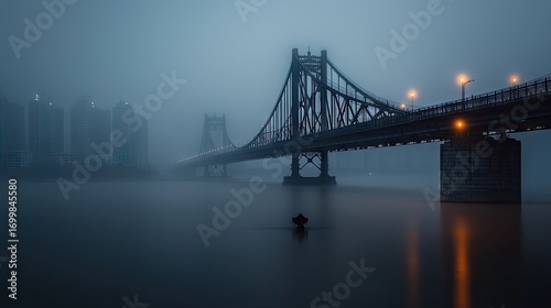 Misty urban bridge over a still river at twilight.