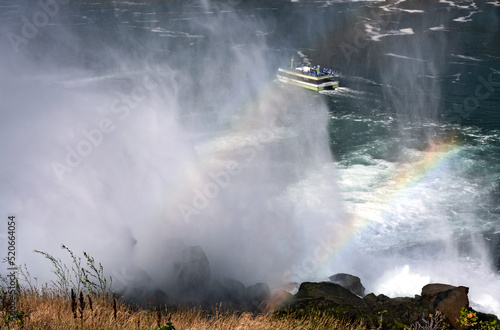 water, nature, waterfall, geyser, mist, rainbow, lake, boat, landscape, park, river, fountain, fall, travel, summer, sky, morning, hot, spray, tree, fog, niagara, grass, green, forest