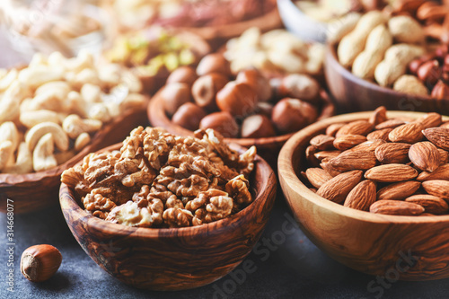Mix nuts in wooden bowls on dark stone table. Almonds, pistachio, walnuts, cashew, hazelnut.