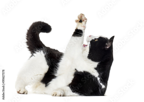 cat, pet, animal, isolated on white, white background, domestic cat, felino, carnivore, mammal, domestic, vertebrate, studio, color image, animal themes, isolated, half face, horizontal, crossbreed, white, black, looking up, paw, reaching, mouth open, alone
