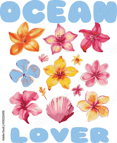mixed flower and sea shell motifs cute surf hibiscus girl painted effect sea ocean Hawaii beach tropical Trending Script Slogan Graphic Tee t-shirt logo artwork typography tote badge emblem crest