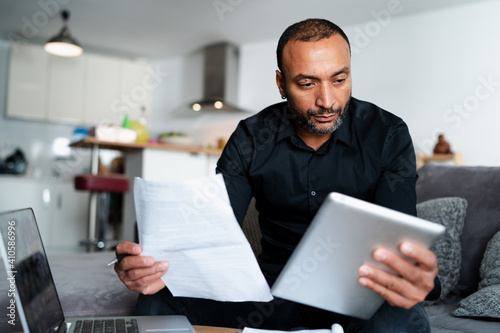 Mixed race man accounting at home
