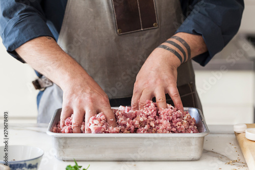 tattoo, sausage, raw, pork meat, mixing, meat, making, kitchen, hand, ground, cooking, closeup, apron, caucasian, white, man, male, person, people, adult, adult, 50s, grown-up, middle-aged