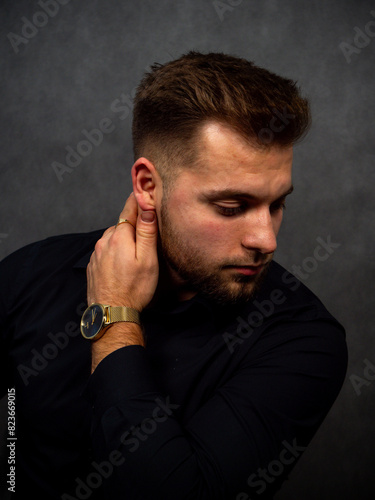 Młody poważny mężczyzna na sesji zdjęciowej w studio