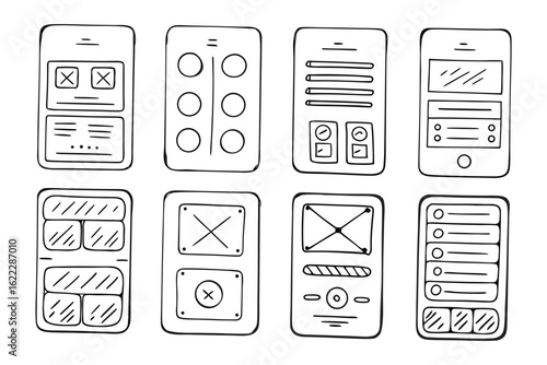 Mobile App Wireframe Designs: A collection of intricate wireframe designs for mobile applications, meticulously drawn to showcase diverse interface layouts and user experience concepts.