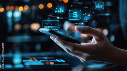 mobile banking & digital financial services concept, person using smartphone centered holographic currency, banking, money transfer icons, integration of technology in modern financial world