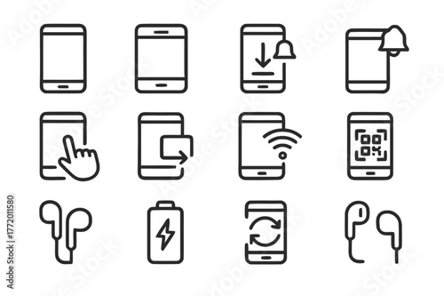 mobile, learning, icon, line, icon, set, smartphone, tablet, offline, download, push, notification