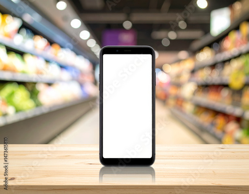 mobile phone displayed on wooden table in grocery store aisle, surrounded by colorful products. phone screen is blank, inviting creativity and personalization