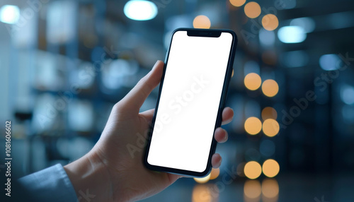 Mobile phone displaying blank screen modern office space digital device photo bokeh background close-up view technology showcase