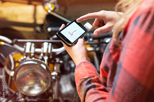 Mobile phone in woman's hands with motorcycle on background