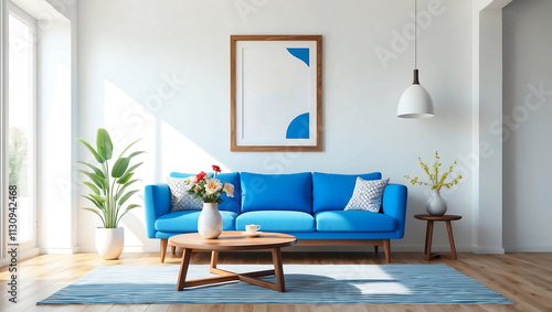 Mock up of a modern bright living room with a beautiful comfortable blue sofa and a stylish decoration.