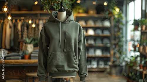 mock up of plain hoodie in shop displayed on mannequin, mannequin standing in front of clothes rack