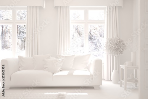 Mock up of stylish room in white color with sofa and winter landscape in window. Scandinavian interior design. 3D illustration