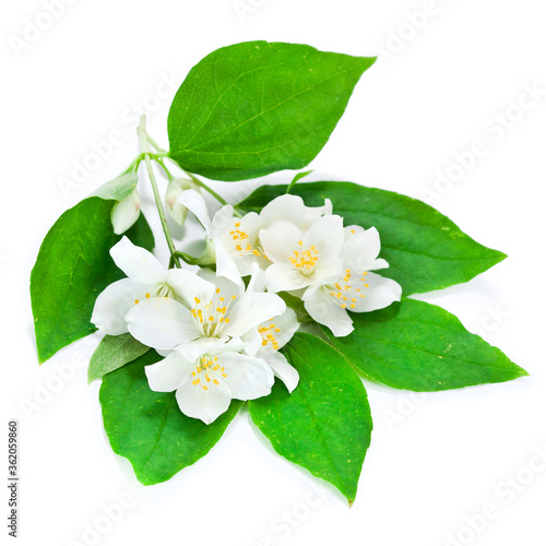 Mock-orange (Philadelphus) flowers with leaves isolated on a white background.