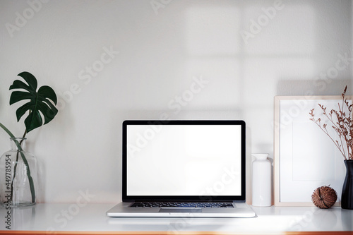 Mockup creative workspace with blank screen laptop computer and supplies on wooden table.