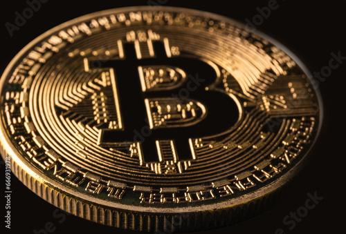 Mockup golden bitcoin close up on black background with clipping path. Bitcoin or BTC is the most popular cryptocurrency in the world powered by blockchain technology. Bitcoin, the digital currency.