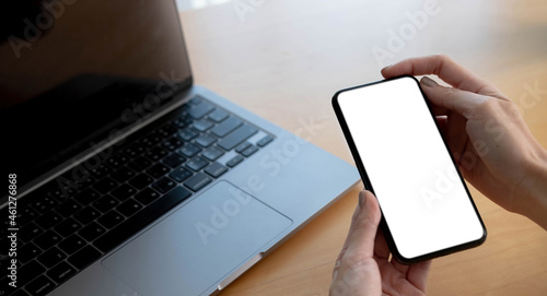 Mockup image blank white screen cell phone.women hand holding texting using mobile on desk at home office.