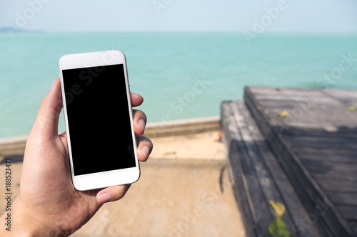Mockup image of a hand holding and showing white mobile phone with blank black desktop screen nearby the sea and old wooden balcony and blue sky background