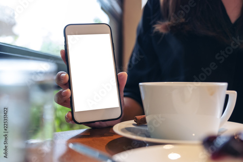 Mockup image of a woman holding and showing white mobile phone with blank screen with coffee and cake on the table in cafe