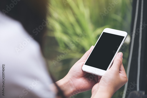 Mockup image of a woman holding white smart phone with blank black desktop screen with blur green nature background