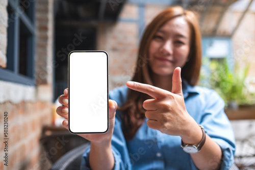 Mockup image of a young woman holding, showing and pointing finger at a mobile phone with blank white screen in the outdoors