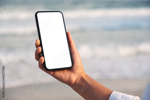 Mockup image of hands holding black mobile phone with blank desktop screen by the sea