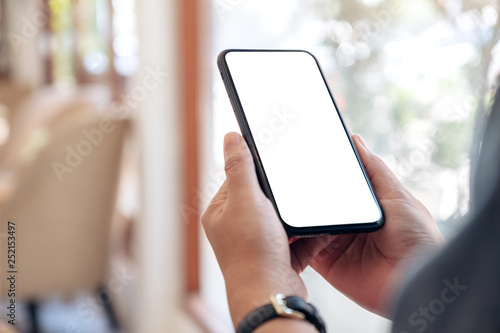 Mockup image of hands holding black mobile phone with blank desktop screen in cafe