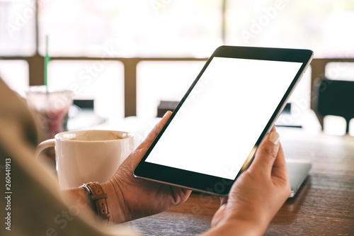 Mockup image of hands holding black tablet pc with blank white screen with coffee cup on wooden table
