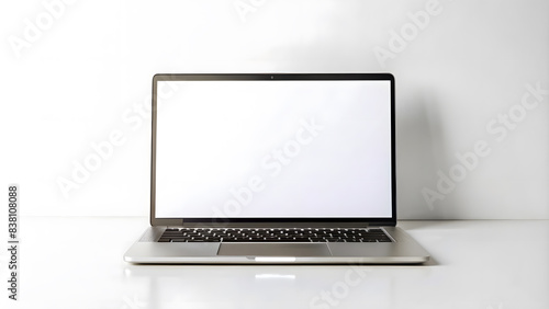Mockup Laptop with blank screen on home office desk. Minimal workspace with blank computer screen mockup on white background