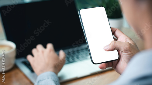Mockup, man hands holding mobile phone with finger touching on blank screen. Man using smartphone, looking at the screen, overhead shot