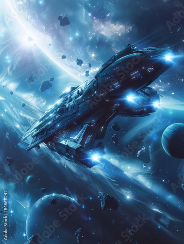 Mockup of a futuristic spaceship traveling through a field of stars and distant planets