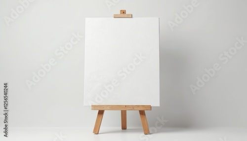 Mockup of blank canvas on wooden easel, set against plain white background. Perfect for art-related content, design workshops. Empty canvas template with clean look on simple stand.