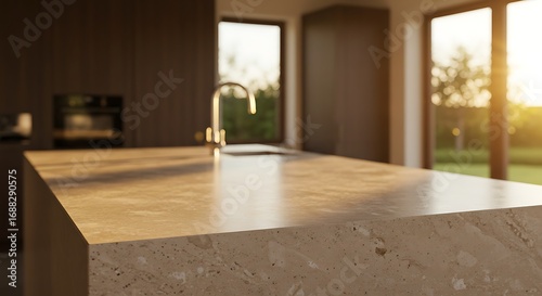 Mockup of modern kitchen island with sink and faucet in a contemporary home with natural light for commercial usage