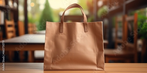 Mockup of wooden paper shopping bag on the wooden table of a clothing store. diffuse background. Brown ecological bag. Recyclable bag for product delivery.