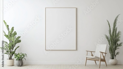 Mockup poster frame on a white wall in a Scandinavian-inspired hipster interior, natural wooden decor, contemporary furniture, ultra-realistic 3D render.