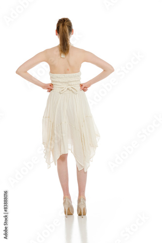 hip, looking, nightlife, adult, back, beautiful, behind, caucasian, considering, copy space, cut-out, cute, dress, evening gown, female, full-length, girl, hand, hip, isolated, isolated on white, model, one person, people, person, rear, standing, studio shot, view, watching, well-dressed, white background, woman, young adult