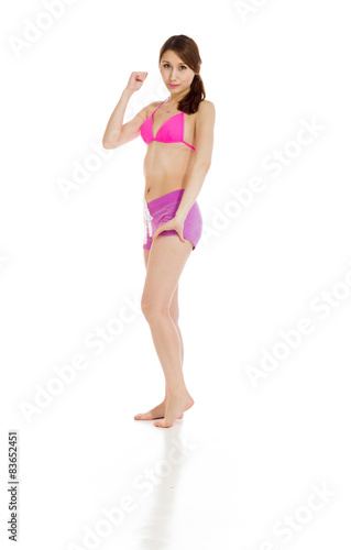 confidence, adult, arm, athlete, athletic, beautiful, bicep, bra, caucasian, copy space, curl, cut-out, cute, exercise, female, fit, fitness, full-length, girl, happiness, isolated, isolated on white, joy, model, muscle, muscular, one person, people, person, pink, power, satisfaction, sexy, short, sports bra, standing, strength, strong, studio shot, success, tank top, white background, woman, young adult, youth