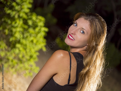 portrait, woman, model, fine-looking, fair, eye, blue, european, spanish, on, his, shoulder, happy, teeth, t-shirt, negress, braces, background, vegetation, plant, bush, sand, parkland, outside, evening