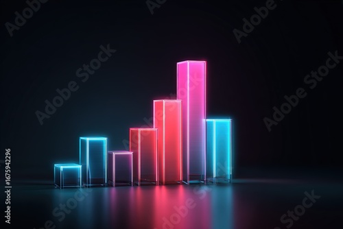Modern 3D render of glowing bar chart on dark background, showing data progress.
