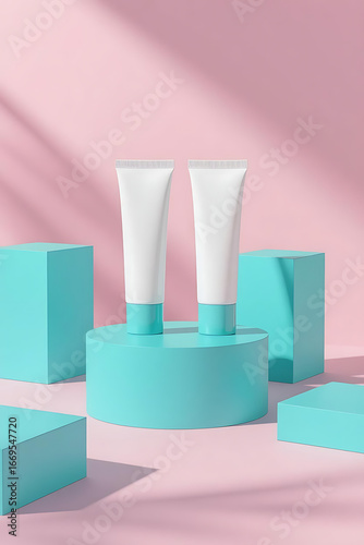 Modern 3D Render of White Cosmetic Tubes on Turquoise Geometric Display.