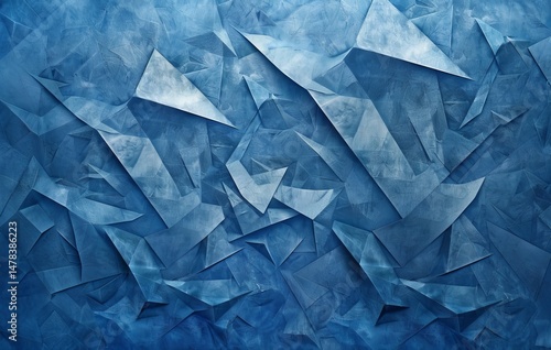 modern abstract blue background design with layers of textured white transparent material in triangle diamond and squares shapes in random geometric pattern