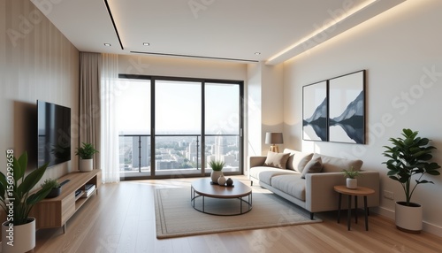 Modern apartment building exterior concept. Modern living room with panoramic city views and stylish décor.