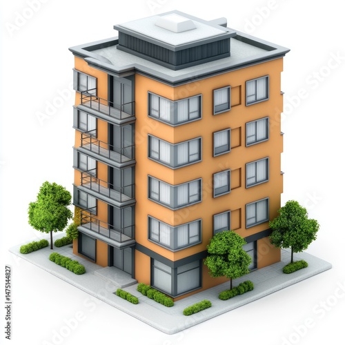 sticker, rendering, cute, building, apartment, facades, illustration, modern, architecture, design, residential, property, urban, city, housing, complex, structure, exterior, elevation, perspective, dwelling, investment, rental, lease, flats, story, window, door, balcony, roof, rooftop, square, orange, beige, grey, tree, landscaping, grass, street, pavement, isometric, digital, three-dimensional, view