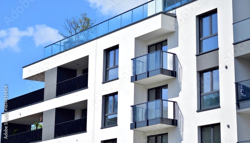 Modern Apartment Building with Balconies with Glass Railings, Blue Sky, and Architectural Design.