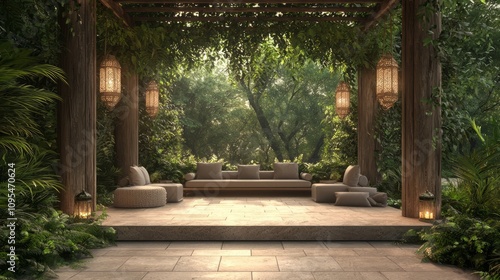 Modern Arabian Oasis: Outdoor Lounge with Comfortable Seating, Lanterns, and Greenery | 3D Render Digital Artwork