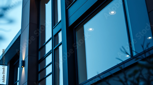 architecture, building, modern, window, glasses, exterior, design, structure, house, home, contemporary, residential, facades, property, urban, night, evening, lighting, sky, blue, dark, steel, frame