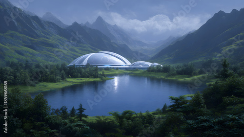 bergsee, mountain landscape, building, architecture, futuristic, modern, lake, landscape, mountain, scenery, nature, contemporary, design, structure, construction, exterior, innovative, urban, metropolitan, artistic, aesthetic, geometric, curve, dome, glasses, metal, engineering, landmark, detail, perspective, scenic, natural, environmental, water, elevation, surrounding