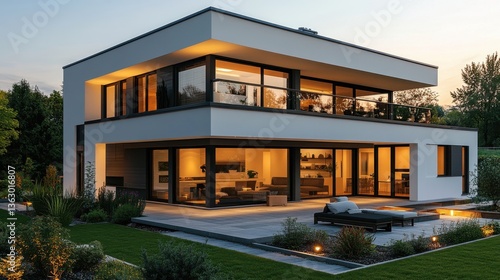 architecture, modern, house, home, design, luxury, building, exterior, residential, property, real estate, contemporary, facades, window, balcony, terrace, landscape, garden, lawn, grass, plant, tree, sky, twilight, evening, light, shadow, illumination, patio, furniture, lounger, stone, tile, pathway, shrub, bush, style, elegance, sophistication, comfort, relaxation, calmness, nature, scenic, perspective, roomy, clean, minimalist