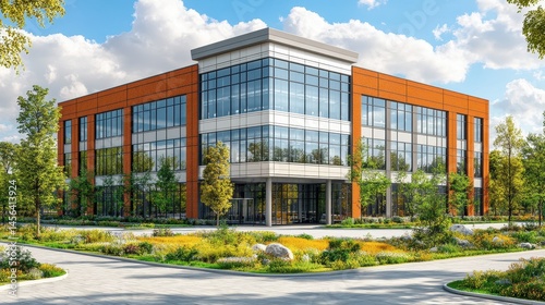 Modern architectural office building with glass facade and lands